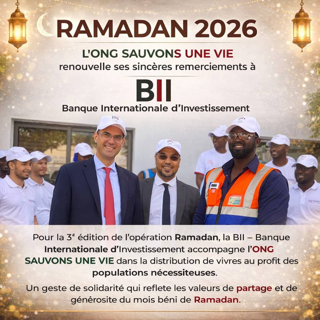 À l’occasion du mois sacré de Ramadan 2026, l’ONG SAUVONS UNE VIE souhaite exprimer sa profonde gratitude envers la Banque Internationale d’Investissement (BII) pour son soutien constant et son engagement dans le cadre de la troisième édition du programme de distribution de vivres destiné aux populations vulnérables.